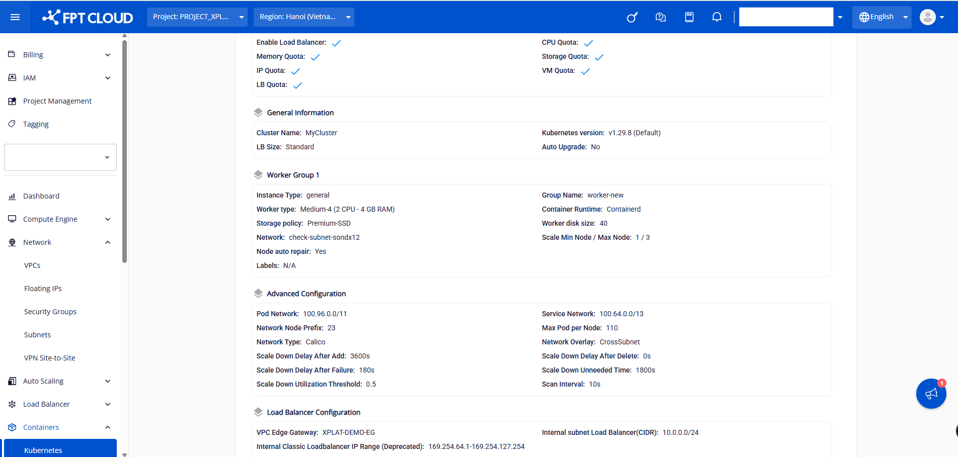 FPT Cloud hỗ trợ khách hàng thay đổi dải Internal subnet load balancer (CIDR) ngay trên Unify portal, để thực hiện khách hàng làm theo các bước sau: Bước 1 : Chọn cluster muốn thay đổi Internal subnet Load Balancer, click vào cluster name. Bước 2 : Chọn tab Advanced , click button Config Internal subnet Load Balancer. Bước 3 : Nhập dải CDIR hợp lệ và click button Confirm Quá trình update Internal subnet Load Balancer sẽ thực hiện trong vòng vài phút, Status của Cluster sẽ chuyển sang Processing. Cluster vẫn hoạt động bình thường khi thực hiện chuyển Internal subnet Load Balancer (CIDR) mới.