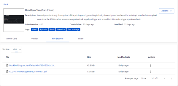 • File Browser: hiển thị các tệp đã upload tương ứng với từng version
