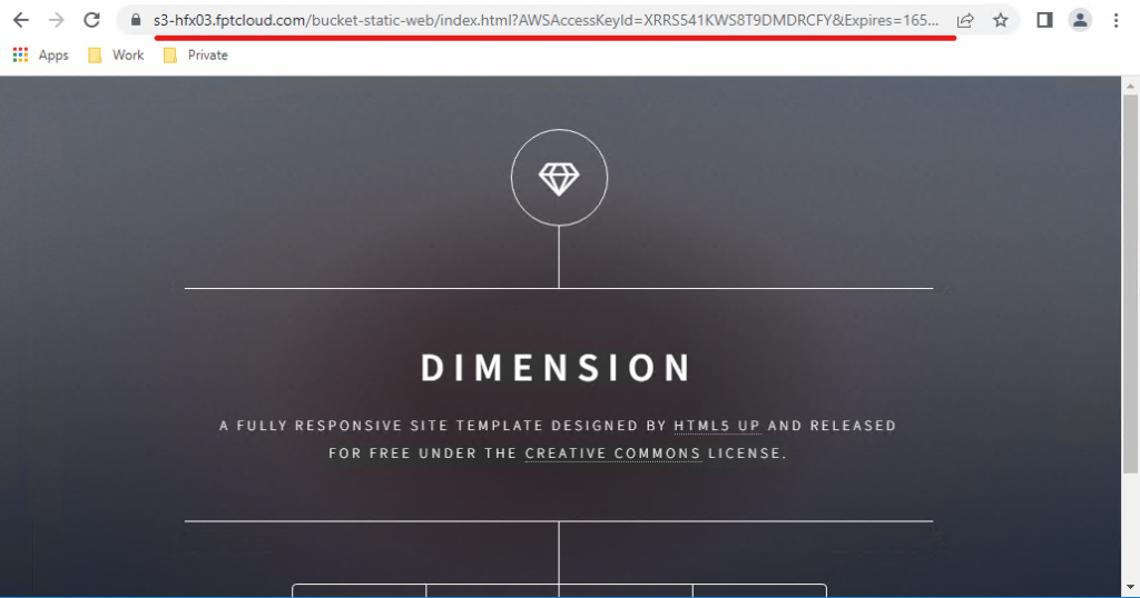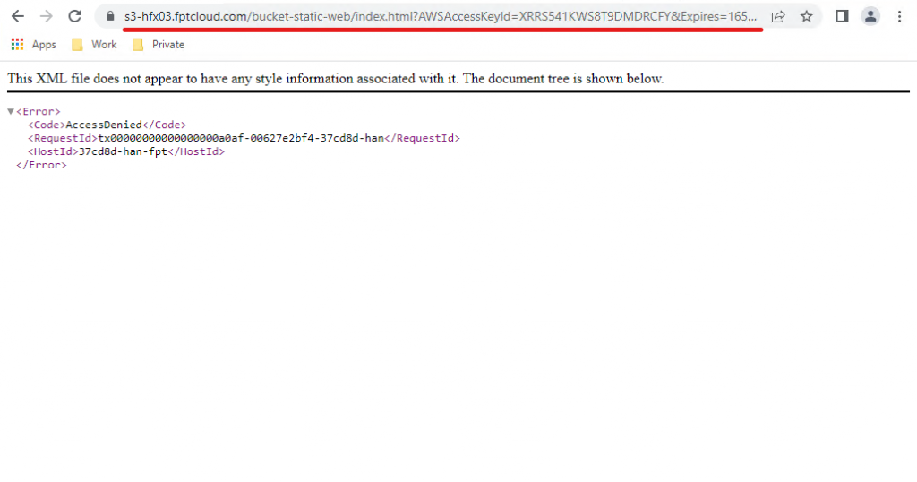 Tính năng tạo public link trong khoảng thời gian xác định cho phép public source web lưu trữ trong bucket. Thông thường có thể được sử dụng trong trường hợp kiểm thử source web hoặc demo. Lưu ý: Tính năng tạo public link trong khoảng thời gian xác định yêu cầu sử dụng S3 Browser Pro. Bước 1: Chọn file html trong bucket > Chọn Generate Web URL. User guide FPT Object Storage 43 Bước 2: Chọn một trong hai kiểu expire theo phút hoặc expire theo thời gian cụ thể (ngày-tháng-năm-giờ-phút-giây) > Copy và truy cập vào link. User guide FPT Object Storage 44 User guide FPT Object Storage 45 Khách hàng có thể kiểm tra sau thời gian expire thì link sẽ hết khả năng truy cập được. User guide FPT Object Storage 46