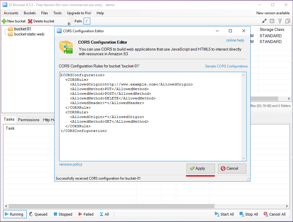 Bước 1: Truy cập vào CORS Configuration trên S3 Browser. User guide FPT Object Storage 47 Bước 2: Gán CORS Configuration Rule dưới dạng XML > Chọn Apply.
