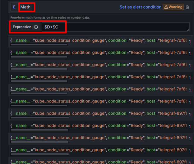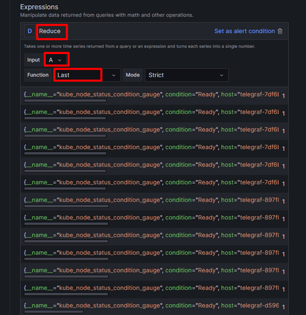 Để tạo alert, bạn thao tác theo hướng dẫn sau: Bước 1 : Vào Home >> Alerting >> Alert rules >> Click New alert rule Alt text Bước 2 : Người dùng config các thông tin alert Ví dụ demo tạo alert khi node k8s trong tag FMON-DEMO not ready. • Đầu tiên, nhập tên alert vào mục 1. Enter alert rule name Alt text • Tiếp theo, config thông tin trong mục 2. Define query and alert condition Với ví dụ trên, nhập query để lấy ra danh sách các node ready (Gọi là bảng A) >> Preview Alt text • Tiếp theo, bạn Add query, chọn datasource là fci-relation-datasource >> Chọn tag, component và nhập response key. Lúc này, hệ thống sẽ trả ra các cluster nằm trong tag FMON-DEMO với component tương ứng (Gọi là bảng C) Alt text • Tiếp đến, bạn Add expression kiểu là Reduce, function= Last để lấy giá trị mới nhất của time series (Gọi là bảng D) Alt text • Add expression với kiểu là Math, merge giữa hai bảng D và C để lọc ra những metric có cluster name trong component ở bảng C (Gọi là bảng E) Alt text • Cuối cùng, Add expression với kiểu là Threshold với input là E, điều kiện là IS_BELOW 1. Tức là nếu giá trị thỏa mãn điều kiện là <1 thì lúc này sẽ bắn alert, ngược lại >=1 là Normal. Alt text Với ví dụ trên, ở bảng E các metric đều có giá trị bằng 1 nên trạng thái là Normal. Bước 3 : Sau khi config các thông tin xong, bạn cần Save rule để bảo toàn thông tin.