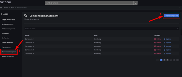 1, Create component Định nghĩa: Component là các thành phần bên trong luồng nghiệp vụ hoặc một business. Ví dụ: Bên trong tag Long Châu có các component như: LoadBalancer, Kubernetes, DB, ... Để tạo component, bạn thực hiện theo hướng dẫn sau: Bước 1 : Truy cập thành công vào dịch vụ Relation management Bước 2 : Trên menu của dịch vụ, click Component management >> Button Create component Alt text Bước 3 : Hiển thị form tạo, người dùng điền các thông tin bao gồm: