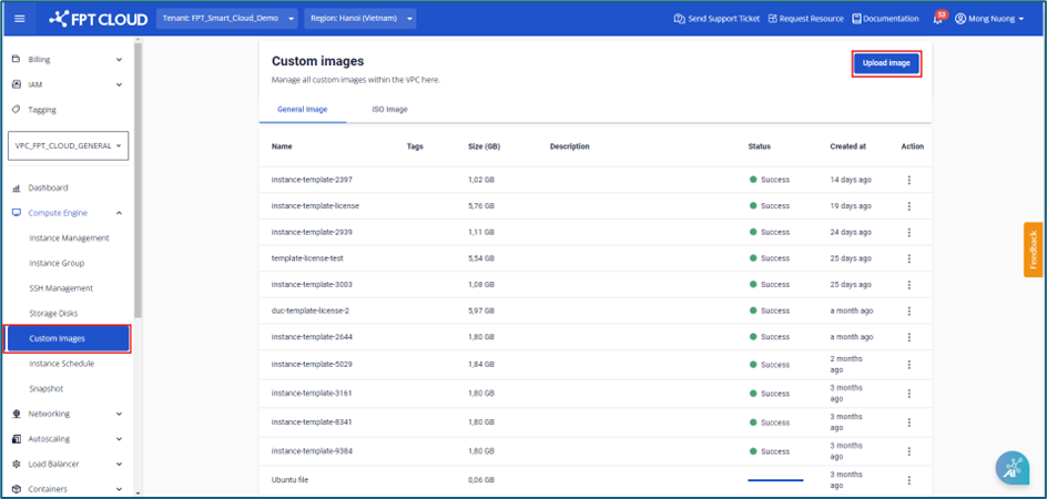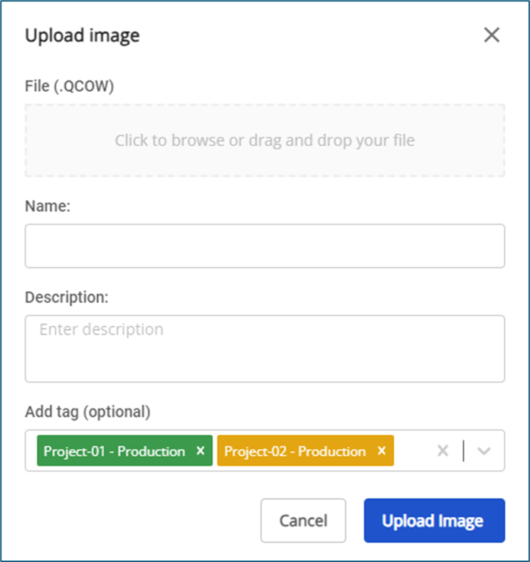 Bước 1 : Ở menu chọn Custom Image > chọn Upload image file Bước 2 : Tại hộp thoại Upload image người dùng có thể chọn tag ở trường Add tag (optional) để gắn tag vào image file