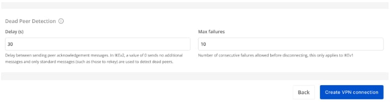 Phần 3: Dead peer detection Sau khi điền đầy đủ thông tin, quý khách hàng vui lòng chọn “Create VPN Connection”