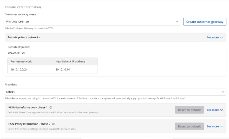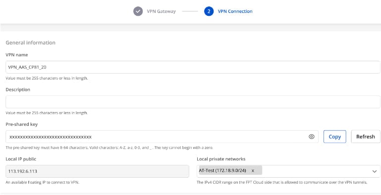 Truy cập và tạo VPN Site To Site trên trang https://console.fptcloud.com/ - Tạo Customer Gateway: +Remote private network: dãy Lan Subnet cần peering của Vyos +Remote IP public: IP public của Vyos - Tạo VPN Connection: Thông số của VPN Connection sẽ bao gồm 3 mục chính: