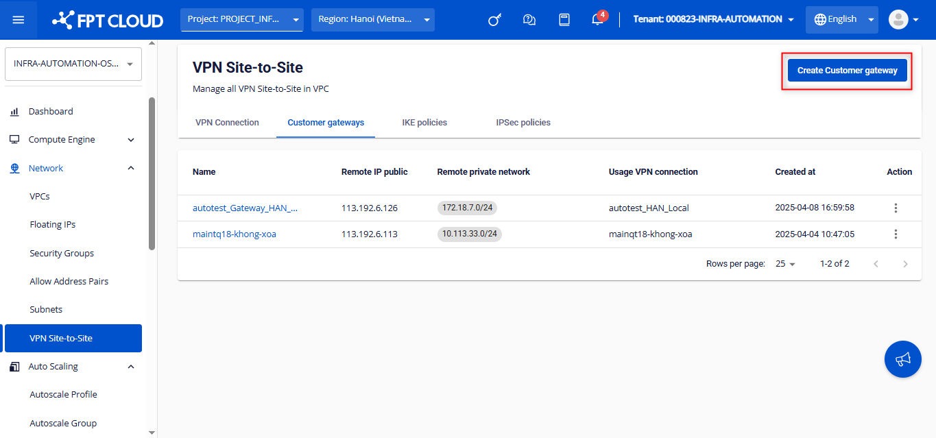 Bước 1: Tại màn hình hiển thị danh sách Customer gateway, chọn Create Customer gateway để thực hiện tạo**.**