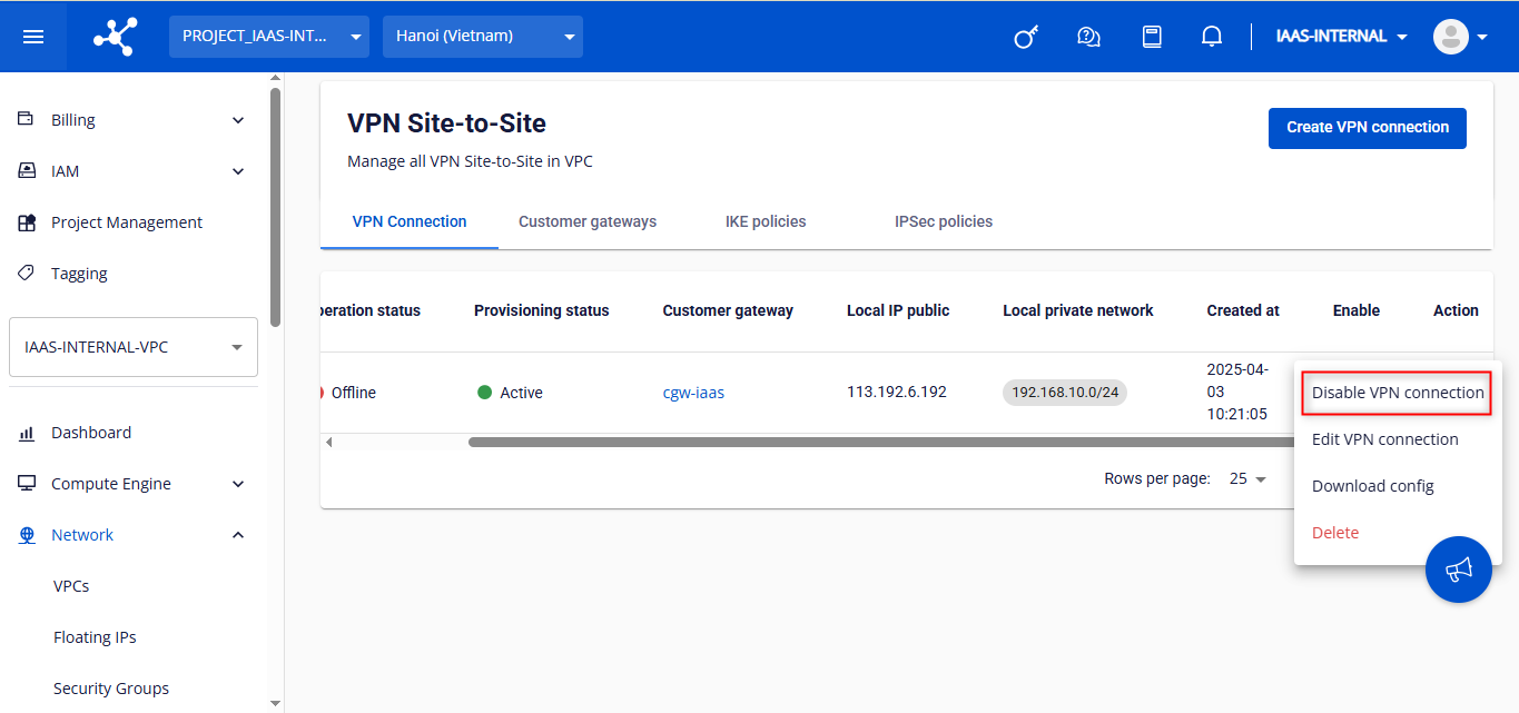 Để disable VPN connection, người dùng chọn Disable VPN connection ở mục Action.