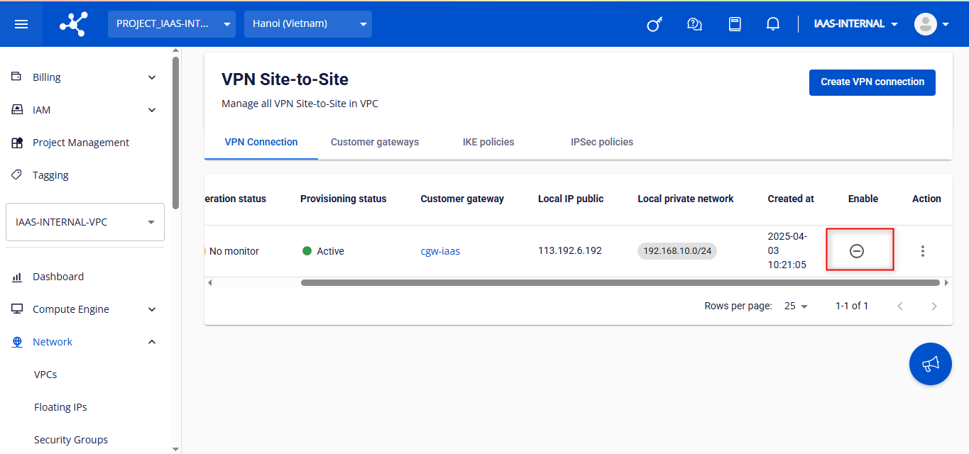 Người dùng kiểm tra trạng thái của VPN Connection khi thực hiện enable thành công: