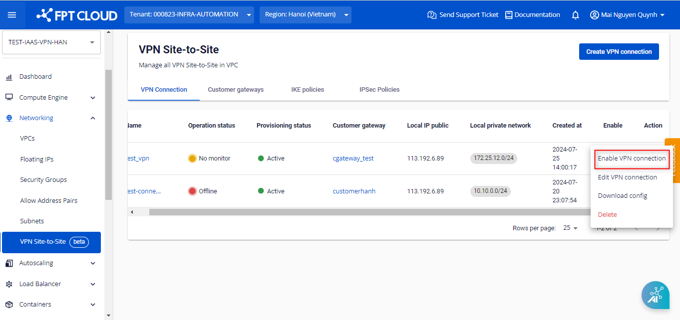 Để enable VPN connection , người dùng chọn Enable VPN connection ở mục Action.