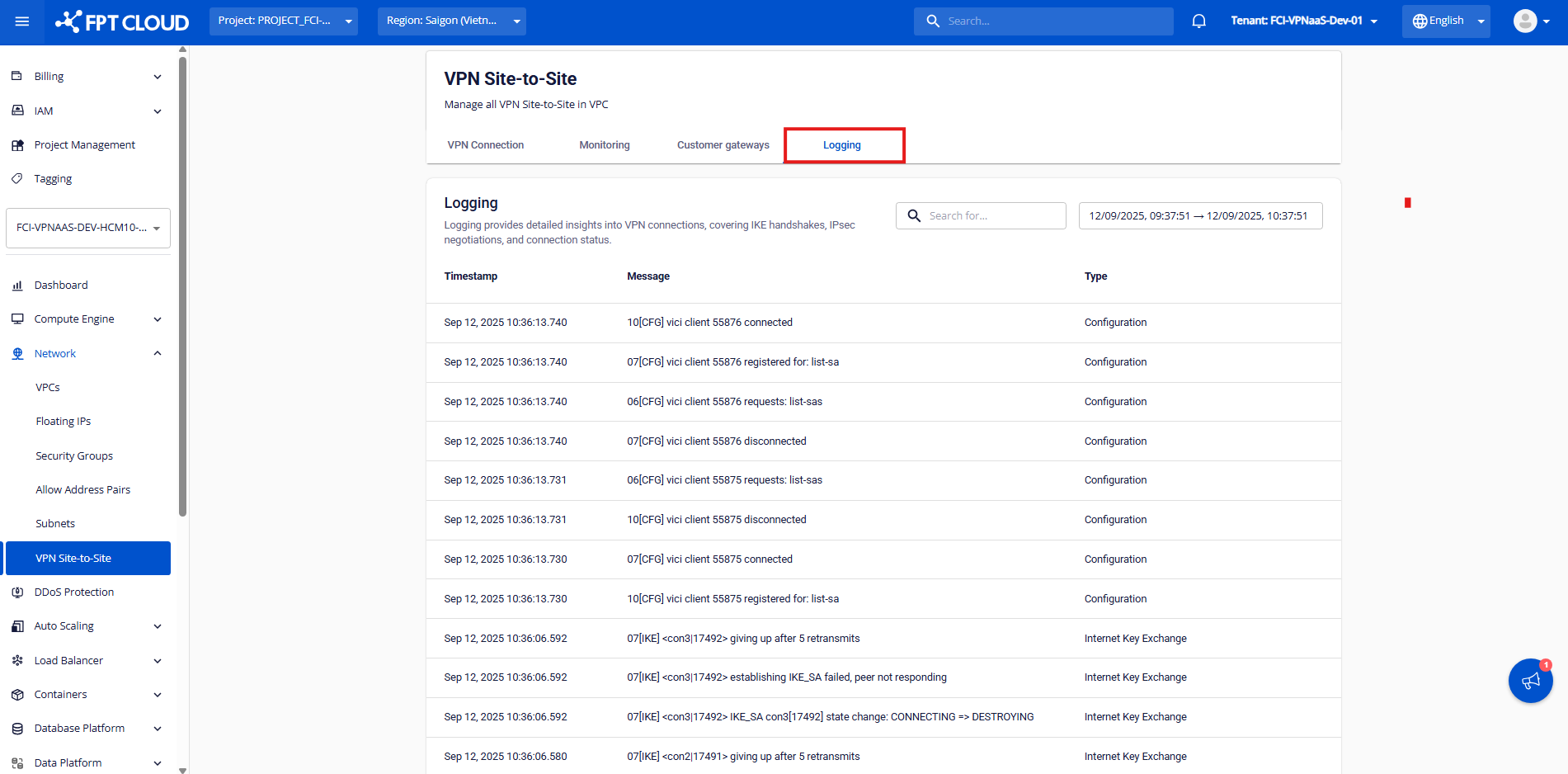 Bài viết này hướng dẫn bạn cách theo dõi và đọc thông tin log của dịch vụ VPN Site-to-Site trên nền tảng FPT Smart Cloud, giúp quý khách hàng dễ dàng kiểm tra trạng thái và xử lý sự cố kết nối Bước 1: Tại màn hiển thị, quý khách chọn Logging trên thanh menu ngang.