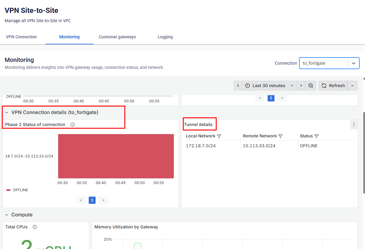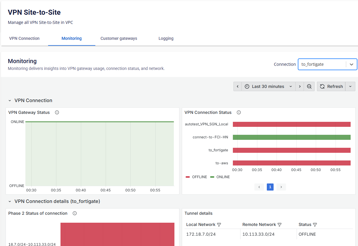 Bài viết này hướng dẫn theo dõi trạng thái và tài nguyên sử dụng của dịch vụ VPN Site-to-site của FPT Smart Cloud. Bước 1: Tại màn hiển thị, quý khách chọn tab Monitoring trên thanh menu ngang. file Bước 2: Quý khách có thể theo dõi Phase 2 của VPN connection cụ thể bằng cách chọn filter tại mục Connection. file