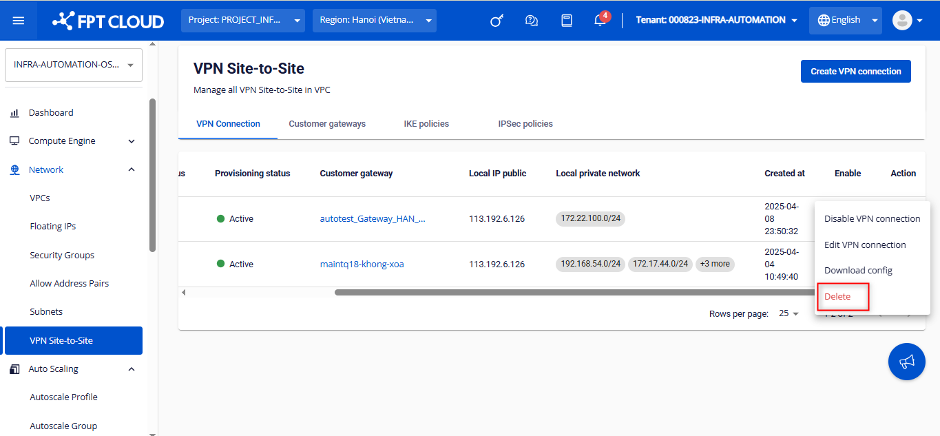 vpn-site-to-siteHướng dẫn xóa VPN ConnectionXoa Vpn Connection Để xoá VPN Connection, người dùng chọn Delete ở mục Action của VPN cần xoá. Một hộp thoại hiện ra, gõ delete và nhấn Delete VPN connection để xoá hoặc nhấn Cancel để huỷ bỏ.